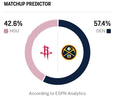 今日ESPN給出本場比賽的勝率預測,火箭為42.6%,掘金為57.4%。