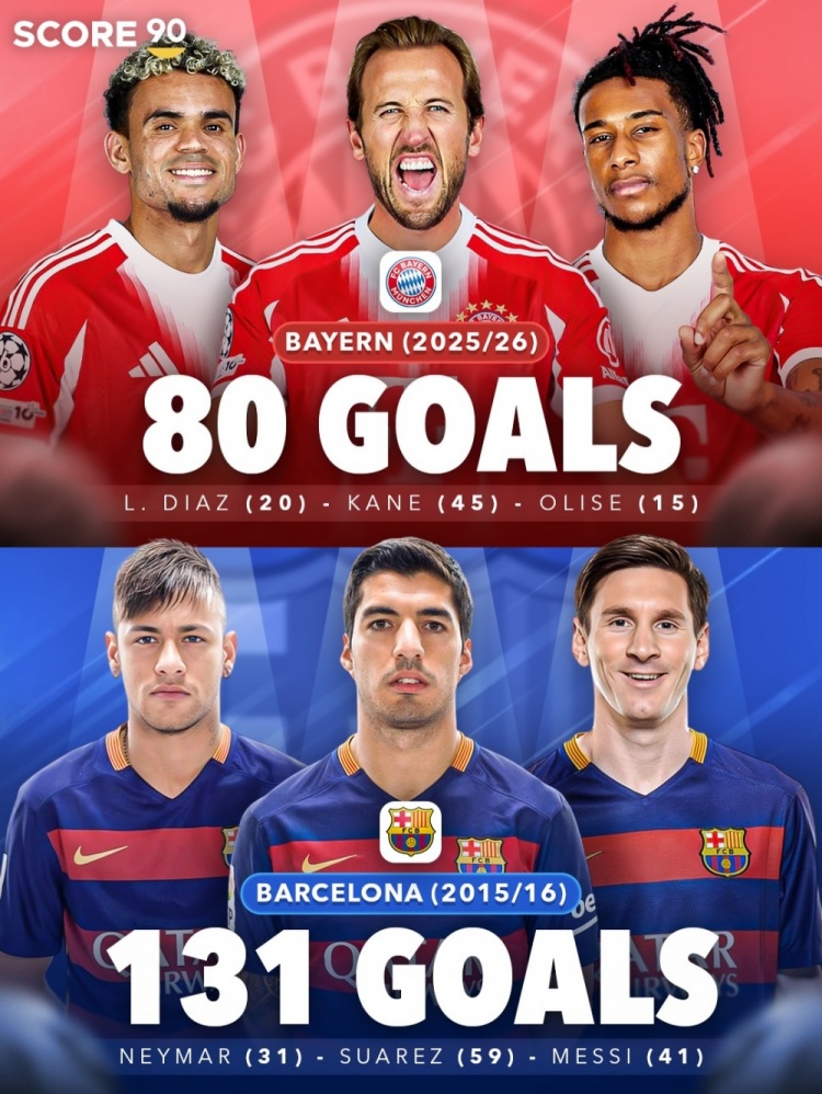 直播吧3月11日訊 本賽季歐洲五大聯(lián)賽的攻擊線,風(fēng)頭最盛的莫過于拜仁凱恩、迪亞斯、奧利塞組成的三叉戟組合。據(jù)score90數(shù)據(jù)統(tǒng)計(jì),拜仁三叉戟截止目前已經(jīng)打進(jìn)80球,距離當(dāng)年在歐洲所向披靡的巴薩MSN組合最高單賽季紀(jì)錄131球,還差51球。