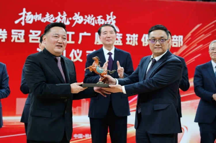 簽約儀式現(xiàn)場,廣廈男籃投資人樓明先生向浙商證券贈送印有冠名商信息的新版簽名球衣,球衣作為球員賽場并肩的“戰(zhàn)袍”,象征著雙方未來同袍同澤、攜手共赴征途;浙商證券回贈一尊朱炳仁銅馬,恰逢農(nóng)歷馬年,銅馬既寓意球隊在賽場上如駿馬馳騁、一馬當(dāng)先,再創(chuàng)競技佳績,也預(yù)示著雙方合作如良馬遇伯樂,攜手并肩、馬到成功。