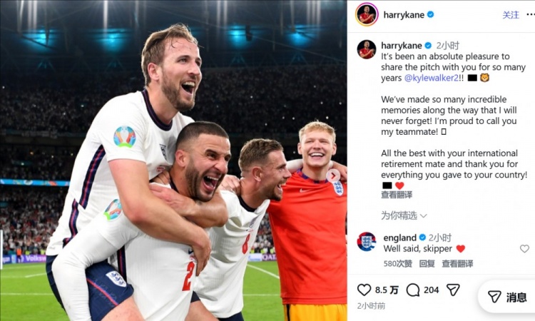 直播吧3月11日訊 在沃克退出英格蘭隊后,他的國家隊隊友凱恩更新社交媒體送上祝福。