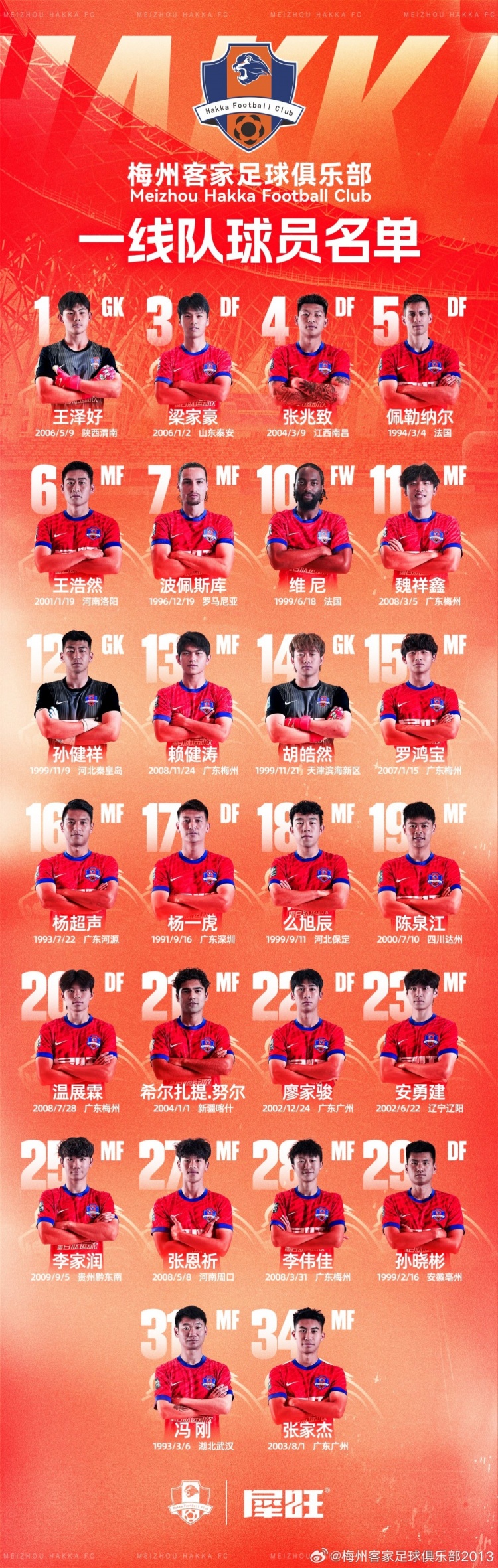 梅州客家新賽季一線隊(duì)名單