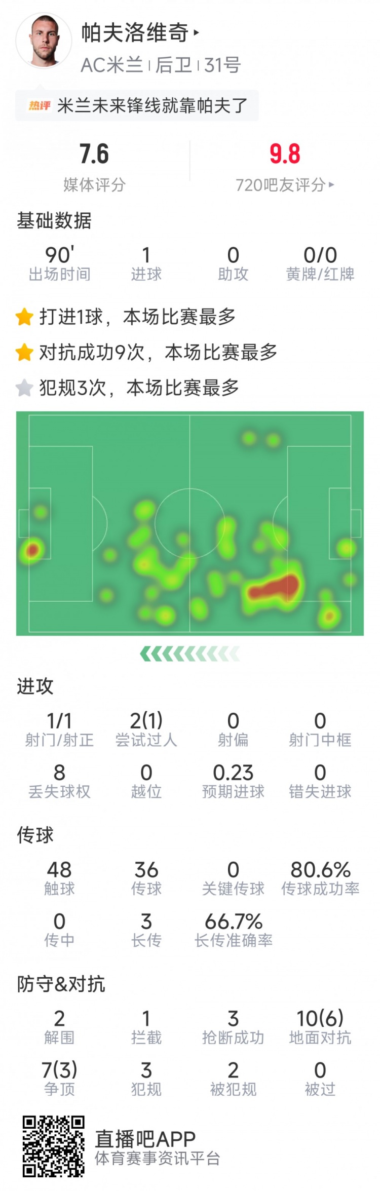 直播吧3月1日訊 在本輪意甲,AC米蘭2-0擊敗克雷莫內(nèi)塞,帕夫洛維奇打進(jìn)關(guān)鍵進(jìn)球,以下為他在本場數(shù)據(jù):