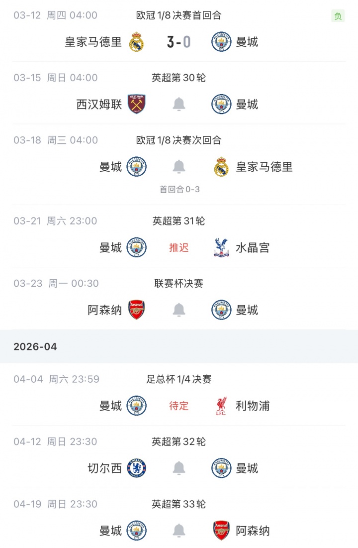 未來(lái)一段時(shí)間,曼城的賽程異常艱難,他們將在英超、歐冠、聯(lián)賽杯(決賽)、足總杯中連戰(zhàn)強(qiáng)敵,四線6場(chǎng)比賽中要對(duì)陣皇馬、利物浦、切爾西,還要兩戰(zhàn)阿森納。