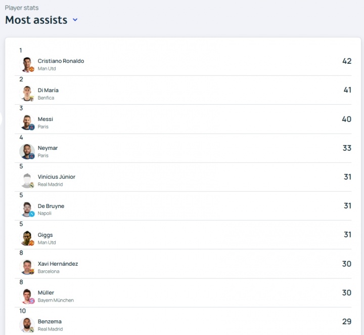 歐冠歷史助攻榜(歐足聯(lián)官網(wǎng)統(tǒng)計):