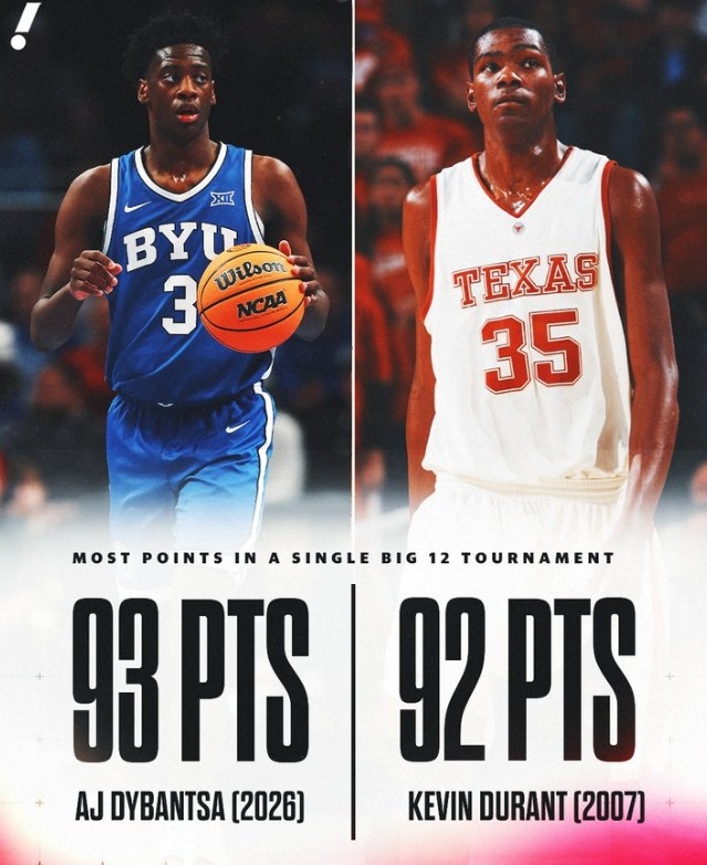 據(jù)統(tǒng)計,在Big 12分區(qū)錦標賽的三場比賽中,迪班薩合砍93分,打破杜蘭特保持的92分紀錄。