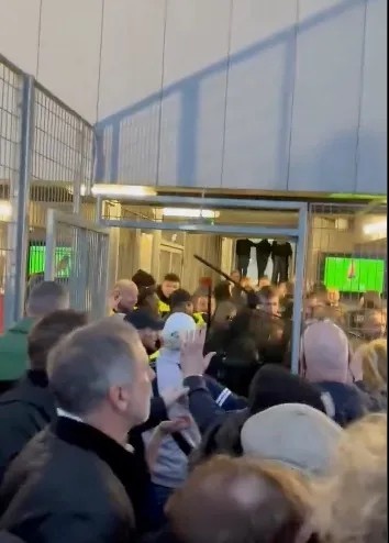 維拉資訊賬號(hào)發(fā)布在社交媒體上的現(xiàn)場(chǎng)視頻顯示,今天凌晨,當(dāng)?shù)貓?zhí)法人員似乎正在向一群隨隊(duì)出征的球迷揮動(dòng)警棍??梢月?tīng)到一名維拉球迷高喊“不”,另一名球迷則試圖阻止沖突進(jìn)一步升級(jí),說(shuō)著“你會(huì)被逮起來(lái)的”。