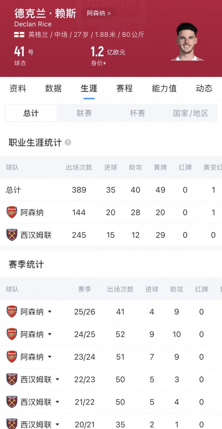 賴斯現(xiàn)年27歲,阿森納2023年花費(fèi)1.17億歐從西漢姆聯(lián)簽下,他為阿森納效力至今出場144次,貢獻(xiàn)20球28助,他現(xiàn)身價1.2億歐,原合同至2028年。