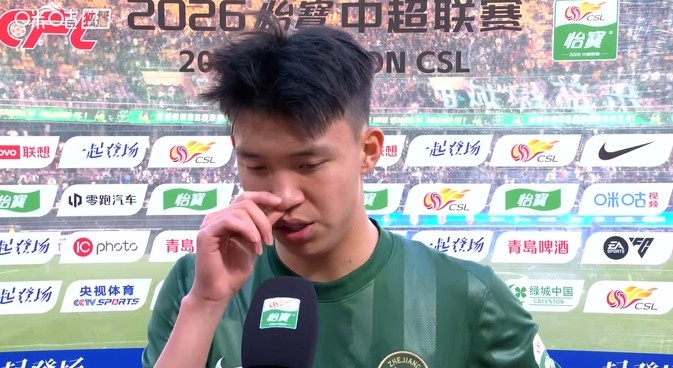 直播吧3月14日訊 中超第2輪,浙江主場1-1申花握手言和,賽后王鈺棟場邊接受記者采訪。