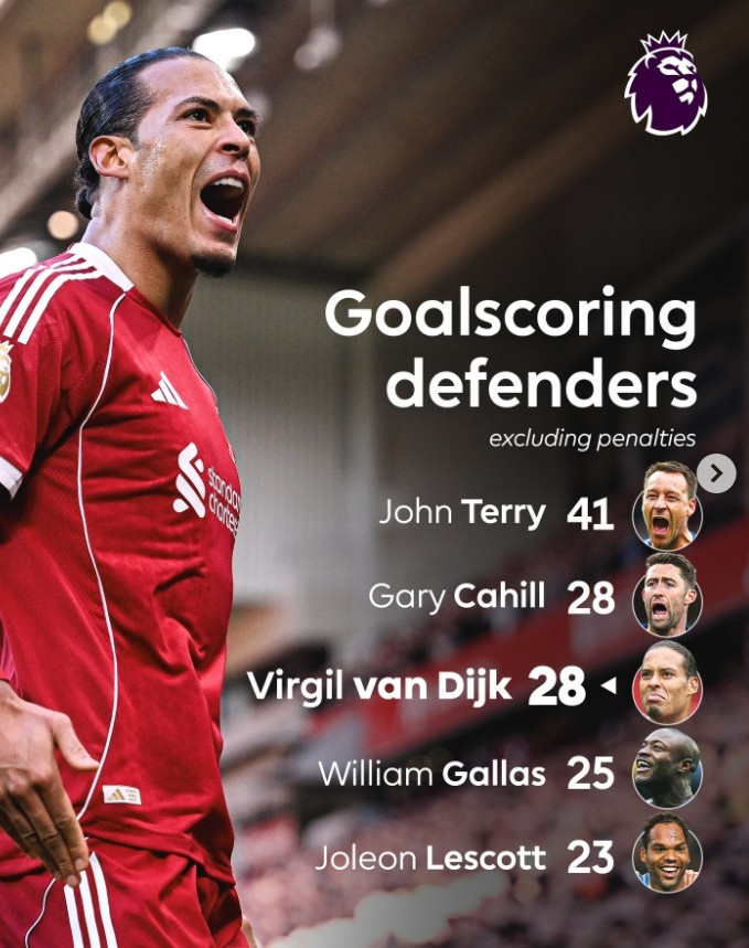 本場比賽范戴克打進(jìn)一球,英超官方統(tǒng)計(jì),范戴克在英超非點(diǎn)球破門次數(shù)追平卡希爾,并列英超后衛(wèi)次席。以下為英超歷史后衛(wèi)非點(diǎn)球破門次數(shù)榜:
