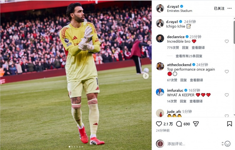 拉亞社媒曬照慶祝勝利+零封,并用日語(yǔ)的羅馬音拼寫(xiě)配文:“一期一會(huì)。”