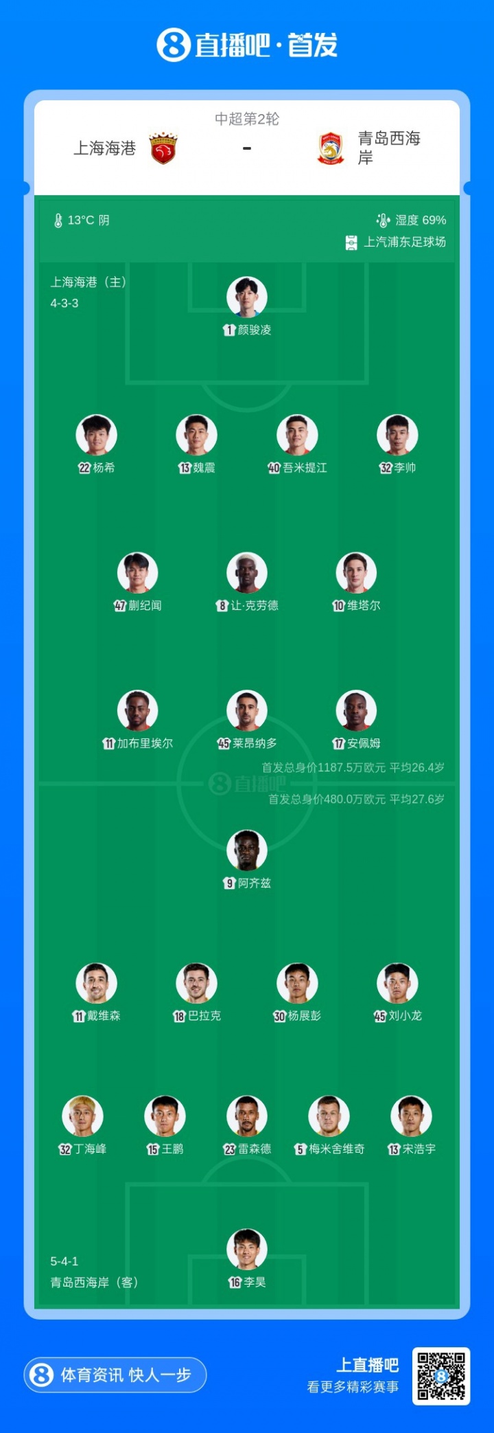 直播吧03月15日訊 中超第2輪,上海海港vs青島西海岸的比賽將在19點開球,賽前首發(fā)陣容出爐。