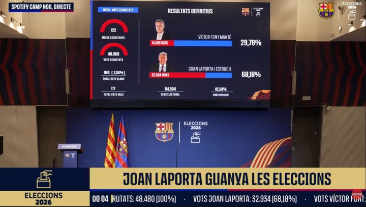 本次大選共有11.4萬名巴薩會(huì)員擁有投票資格,共48480位會(huì)員參與,參與度達(dá)到了42.4%。