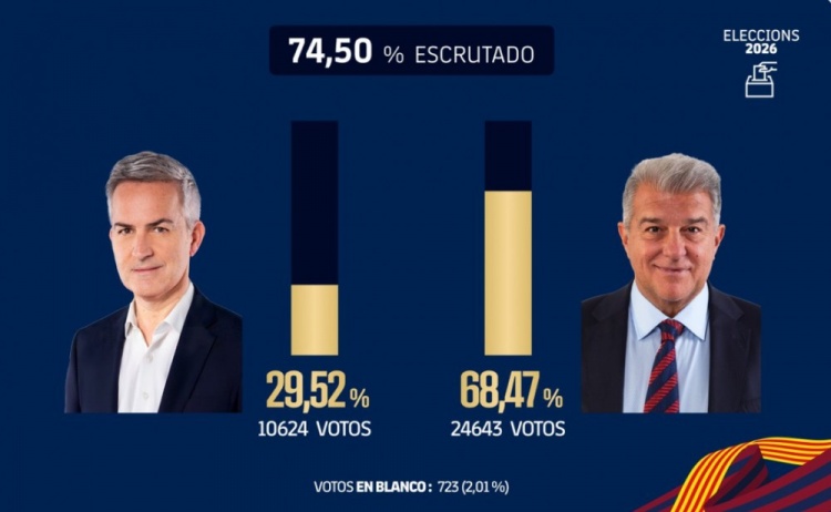 直播吧3月16日訊 巴薩主席選舉計(jì)票工作正在進(jìn)行之中,俱樂部官方再次公布了得票情況。目前,在統(tǒng)計(jì)了74.5%的投票后,拉波爾塔的得票率高達(dá)68.47%,而他的競爭對手豐特則為29.52%。