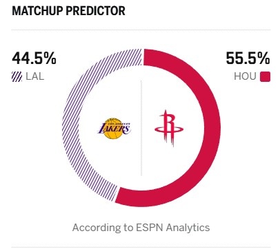 ESPN今日給出了本場(chǎng)勝率預(yù)測(cè),火箭55.5%稍占上風(fēng),湖人為44.5%。