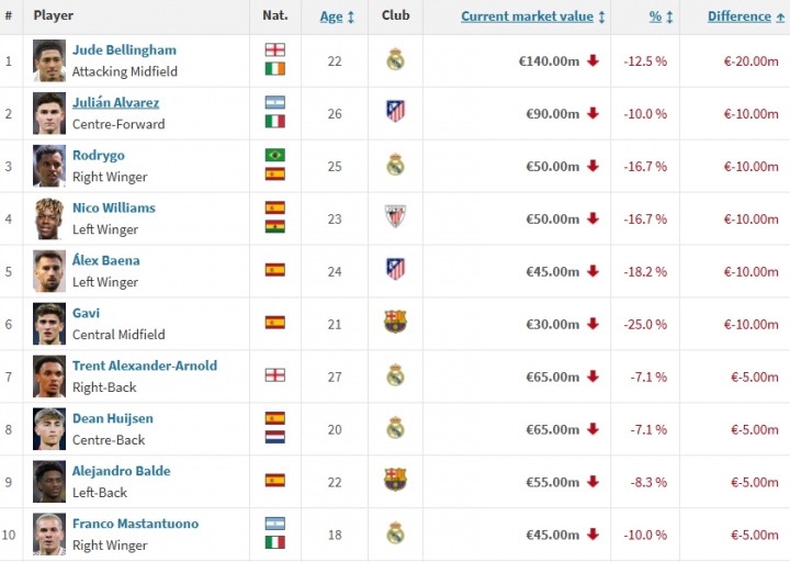 貝林厄姆(皇馬):1.4億歐(下跌2000萬)