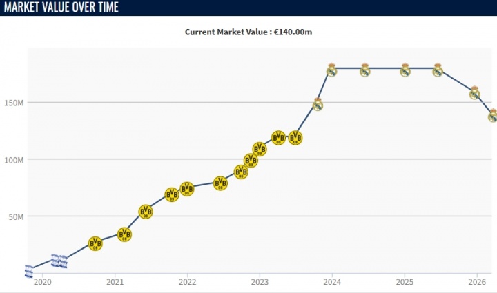 此前貝林厄姆德轉(zhuǎn)巔峰身價(jià)為1.8億歐元,但德轉(zhuǎn)本賽季兩次更新,球員身價(jià)均有下降。本賽季貝林厄姆受到傷病困擾,各賽事目前出場(chǎng)28次,貢獻(xiàn)6球4助。