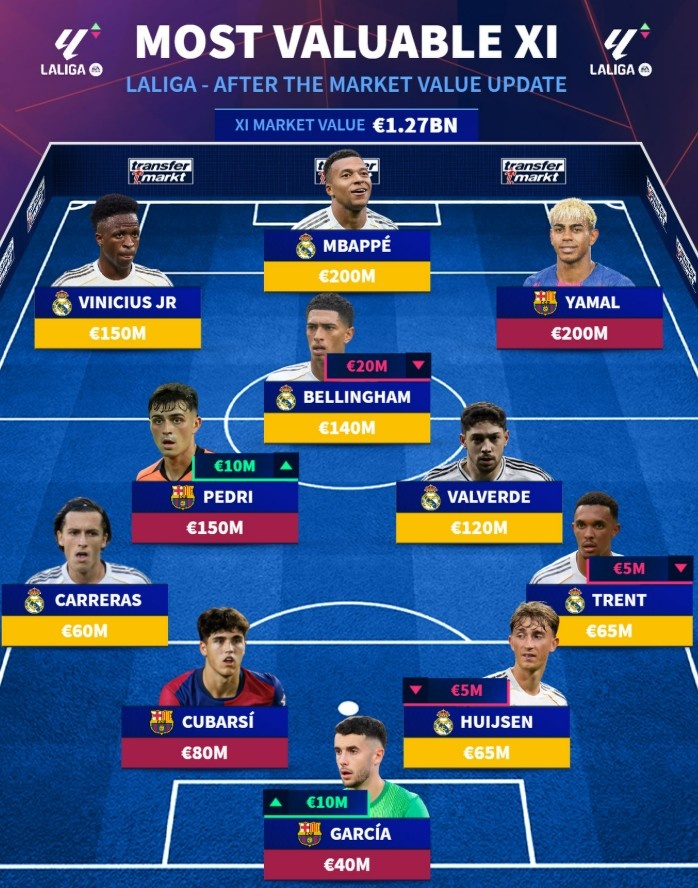 中場(chǎng):佩德里(巴薩,1.5億歐)、貝林厄姆(皇馬,1.4億歐)、巴爾韋德(皇馬,1.2億歐)