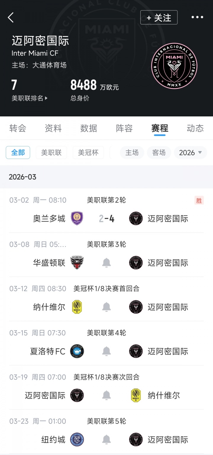 3月份接下來(lái)的賽程,邁阿密將對(duì)陣華盛頓聯(lián)、納什維爾(2場(chǎng))、夏洛特FC以及紐約城。梅西突破職業(yè)生涯900球,很可能在本月實(shí)現(xiàn)。