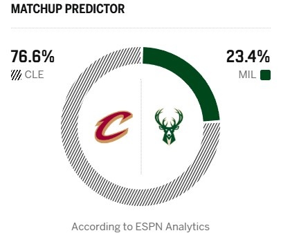 今日ESPN給出了本場比賽的勝率預(yù)測,騎士高達76.6%,雄鹿只有23.4%。