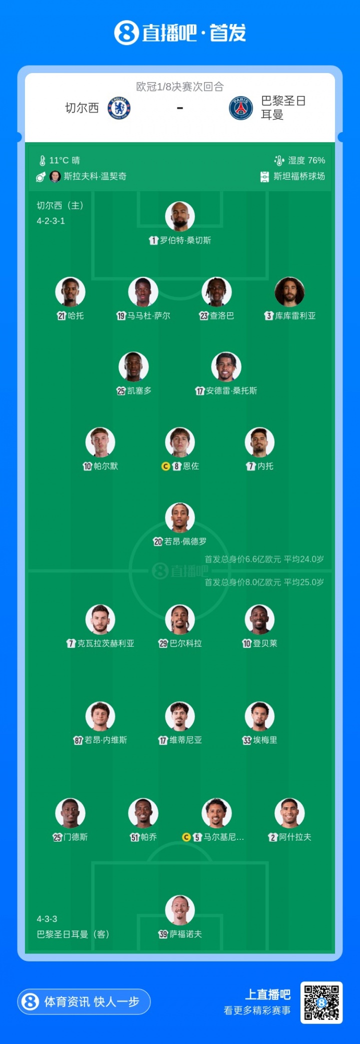 切爾西首發(fā):1-桑切斯、3-庫庫雷利亞、19-薩爾、21-哈托、23-查洛巴、25-凱塞多、8-恩佐、17-安德雷·桑托斯、7-內(nèi)托、10-帕爾默、20-若昂·佩德羅
