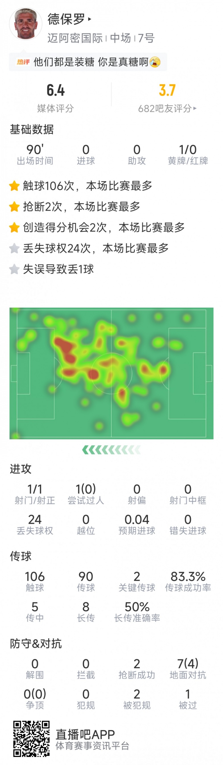 直播吧3月2日訊 在本輪美職聯(lián),邁阿密國際4-2逆轉(zhuǎn)戰(zhàn)勝奧蘭多城。本場比賽德保羅傳球失誤導(dǎo)致丟球,以下為他在本場數(shù)據(jù):