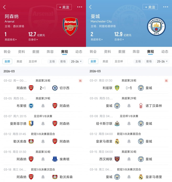 3月份接下來的賽程,阿森納和曼城在月底的聯(lián)賽杯決賽之前,均還有5場比賽,將在14天內(nèi)打完。加上聯(lián)賽杯決賽,兩隊(duì)將是19天6戰(zhàn)。