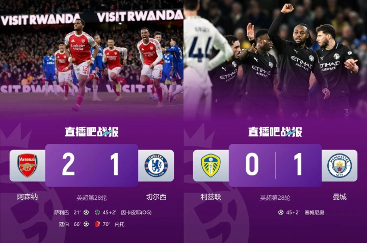 直播吧03月02日訊 英超第28輪全部戰(zhàn)罷,爭冠兩隊(duì)阿森納2-1擊敗切爾西,曼城1-0擊敗利茲聯(lián)。