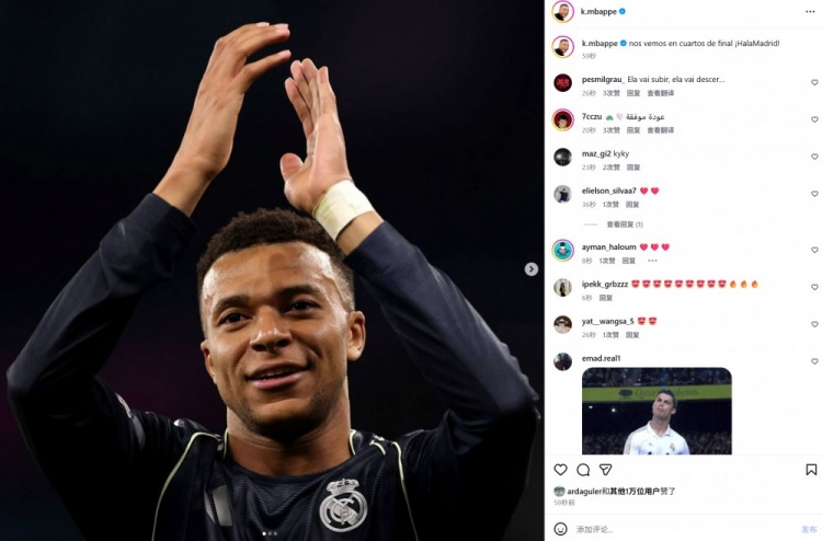 本場(chǎng)比賽姆巴佩替補(bǔ)登場(chǎng)迎來(lái)復(fù)出,賽后他也在社媒曬照慶祝勝利,配文寫道:“我們四分之一決賽見!Hala Madrid!”