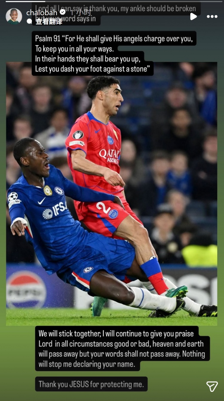 切爾西后衛(wèi)查洛巴拼搶時(shí)被阿什拉夫踩到腳踝,因傷離場(chǎng),賽后查洛巴社媒曬出照片,并寫(xiě)道:“主啊,我唯一能說(shuō)的就是感謝你,我的腳踝本該骨折,但你的話語(yǔ)在《詩(shī)篇》91篇中說(shuō),‘因祂要為你吩咐祂的使者,在你行的一切道路上保護(hù)你。他們要用手托著你,免得你的腳碰在石頭上?!?”