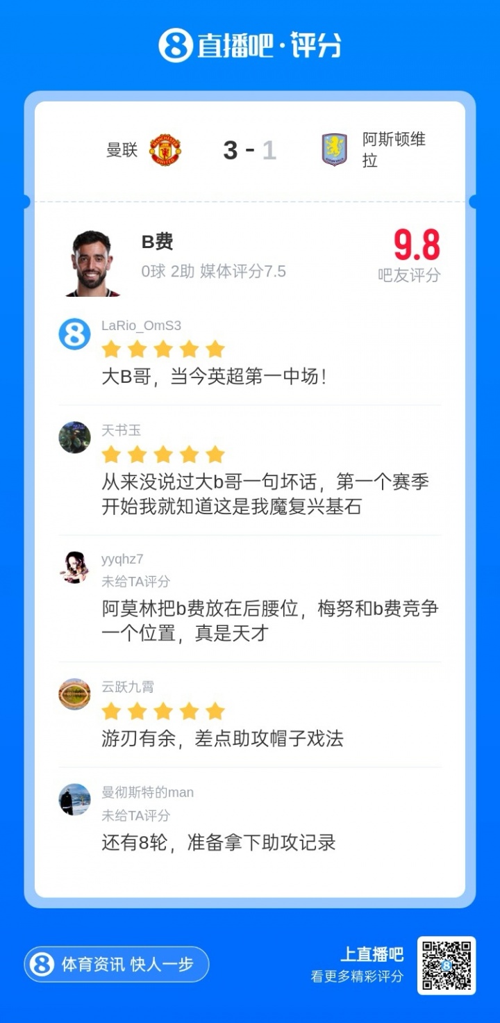 這是B費本賽季第5次當(dāng)選【直播吧X咪咕體育英超每輪MVP】評選最佳。吧友熱評:游刃有余,差點助攻帽子戲法!大B哥當(dāng)今英超第一中場!