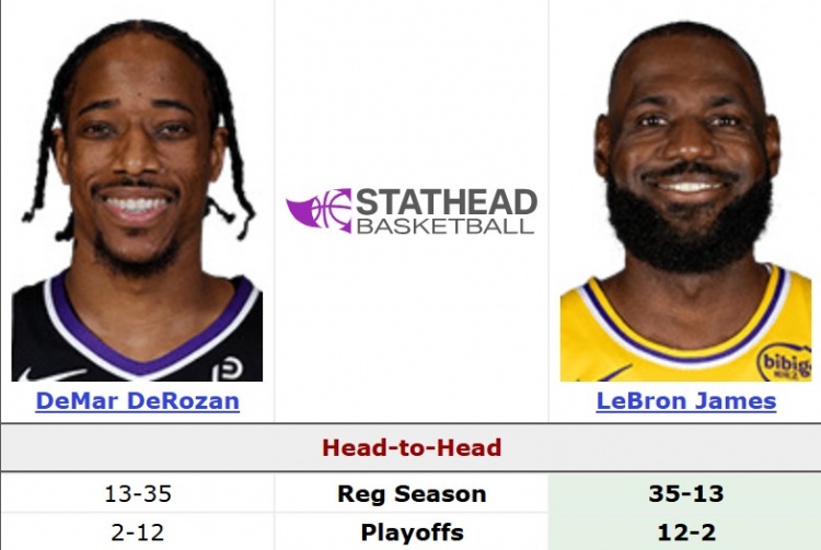 生涯至今,德羅贊常規(guī)賽面對詹姆斯13勝36負(fù)(勝率26.5%),季后賽2勝12負(fù)(14.2%)。