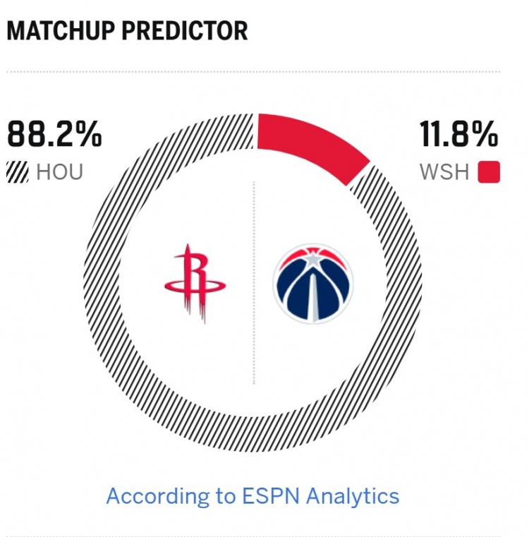 ESPN對本場勝率進(jìn)行了預(yù)測,火箭勝率高達(dá)88.2%,奇才則是11.8%。