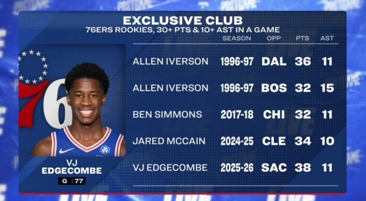 埃奇庫姆單場30+10助隊(duì)史新秀第4人!比肩艾弗森&本西&麥凱恩