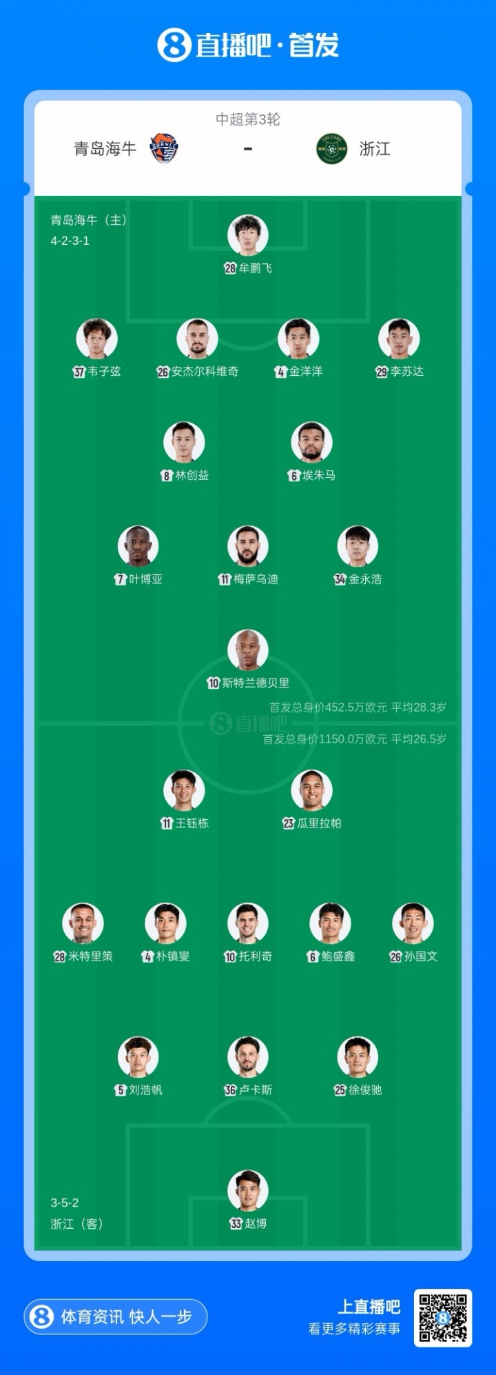 直播吧03月20日訊 北京時間今晚19點35分,本賽季中超第3輪,青島海牛坐鎮(zhèn)主場對陣浙江隊,賽前首發(fā)陣容出爐?!?strong>鄺兆鐳由于要參加U17國足集訓(xùn),因此無緣本場比賽。葉博亞、斯特蘭德貝里先發(fā),王鈺棟、米特里策出戰(zhàn)】