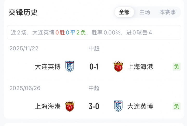 積分榜方面,大連英博本賽季前兩輪全敗,目前積0分排在第8位;上海海港則是1勝1負(fù),目前負(fù)2分排在第11位。