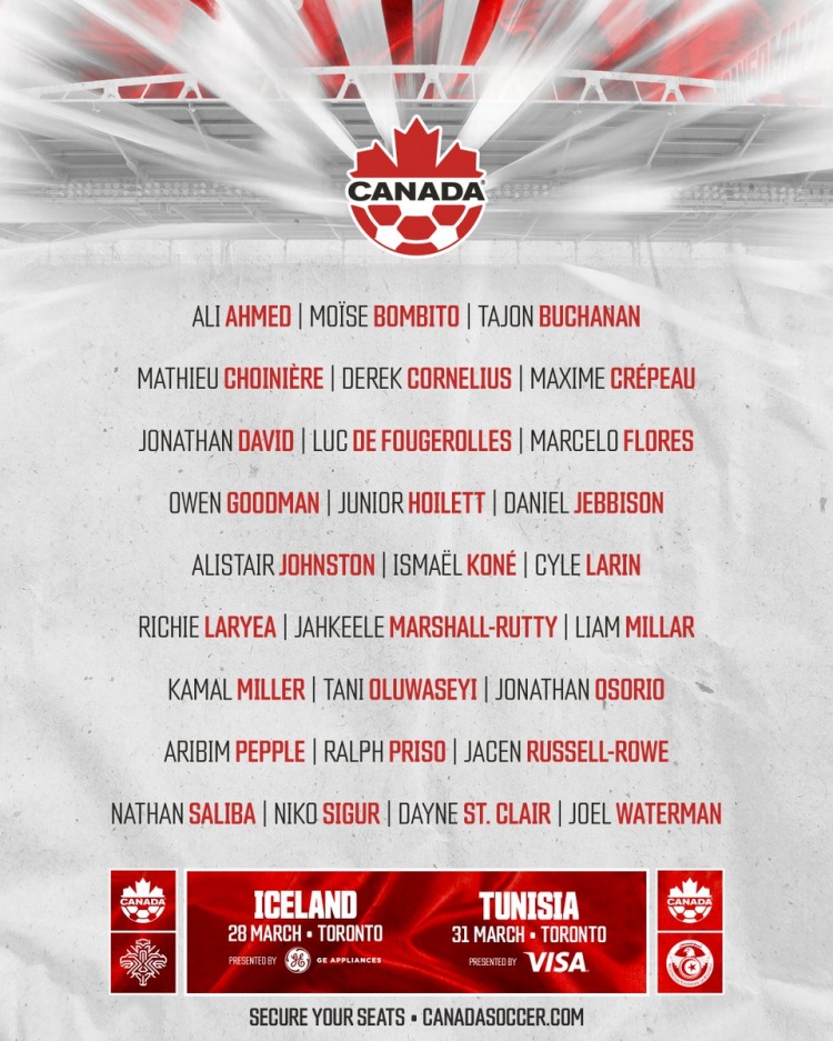 直播吧3月20日訊 加拿大國(guó)家隊(duì)公布新一期名單,戴維領(lǐng)銜,阿方索·戴維斯缺席,加拿大將在友誼賽中對(duì)陣冰島、突尼斯。