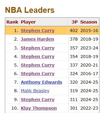 而在聯(lián)盟三分?jǐn)?shù)據(jù)的頂端,有一座幾乎無法企及的高峰——勇士球星庫里在2015-16賽季創(chuàng)造的402記三分命中紀(jì)錄。10年過去,無人逼近,甚至無人敢言打破。