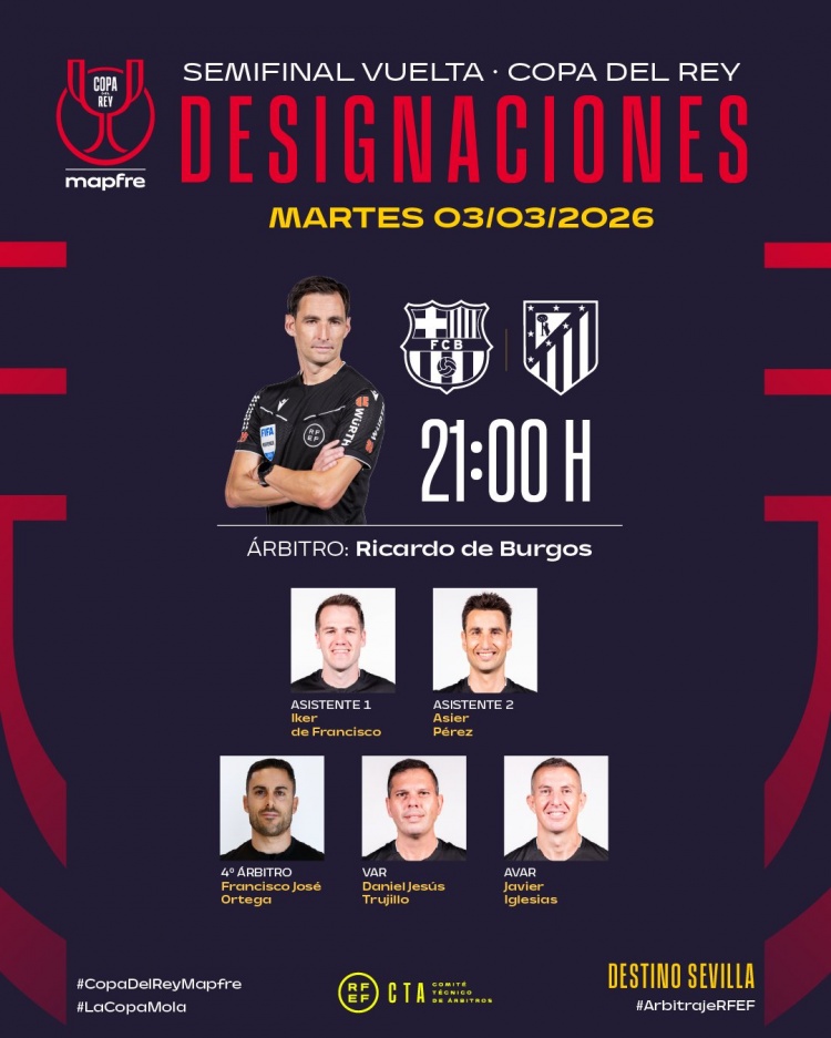 直播吧3月2日訊 北京時(shí)間3月4日凌晨4:00,國(guó)王杯半決賽次回合,巴薩將坐鎮(zhèn)主場(chǎng)迎戰(zhàn)馬德里競(jìng)技。賽前,西班牙足協(xié)官方公布了本場(chǎng)比賽裁判安排,里卡多·德·布爾果斯執(zhí)法。