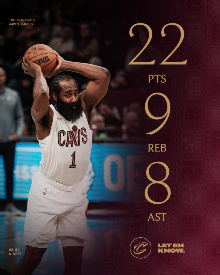 直播吧3月2日訊 今日NBA常規(guī)賽,騎士106-102力克籃網(wǎng)。