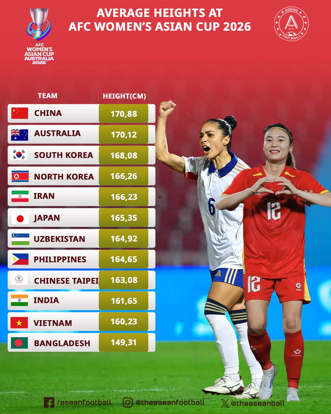 據(jù)統(tǒng)計(jì),本屆女足亞洲杯,中國女足平均身高170.88cm,在12支參賽球隊(duì)中“海拔”第一;今日的對手孟加拉國女足平均身價(jià)149.31cm,排名墊底。