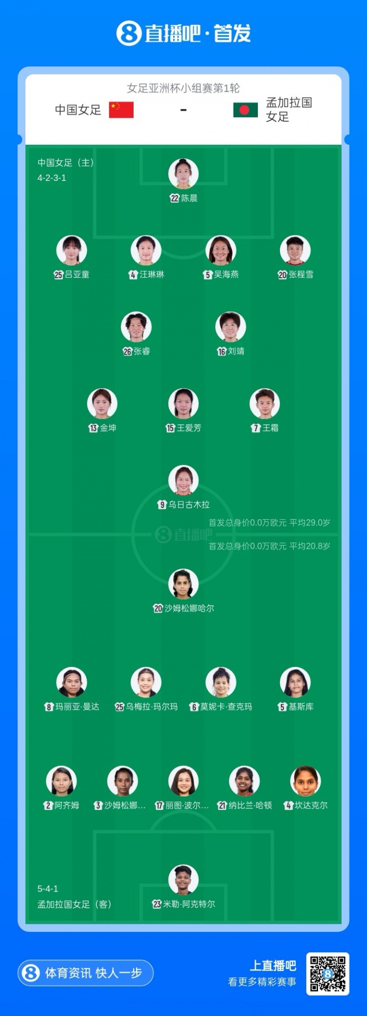 直播吧03月03日訊 2026年澳大利亞女足亞洲杯小組賽,中國女足vs孟加拉國女足首發(fā)出爐。中國女足首發(fā)平均年齡29歲,孟加拉國女足平均年齡20.8歲。