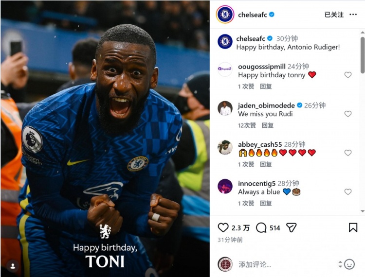 直播吧3月3日訊 今天是德國(guó)中衛(wèi)呂迪格的33歲生日,老東家切爾西為他慶生。