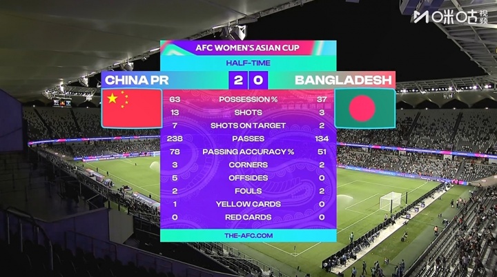 半場戰(zhàn)罷,中國女足控球率63%,13射7正打入2球,對手3射2正。中國女足上半場多次出現(xiàn)傳球失誤及錯失良機的情況。