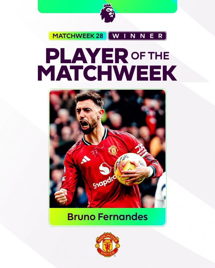 英超官方宣布,經(jīng)過球迷的投票,B費(fèi)當(dāng)選本輪英超最佳球員,本賽季第四次獲得這一獎(jiǎng)項(xiàng)。