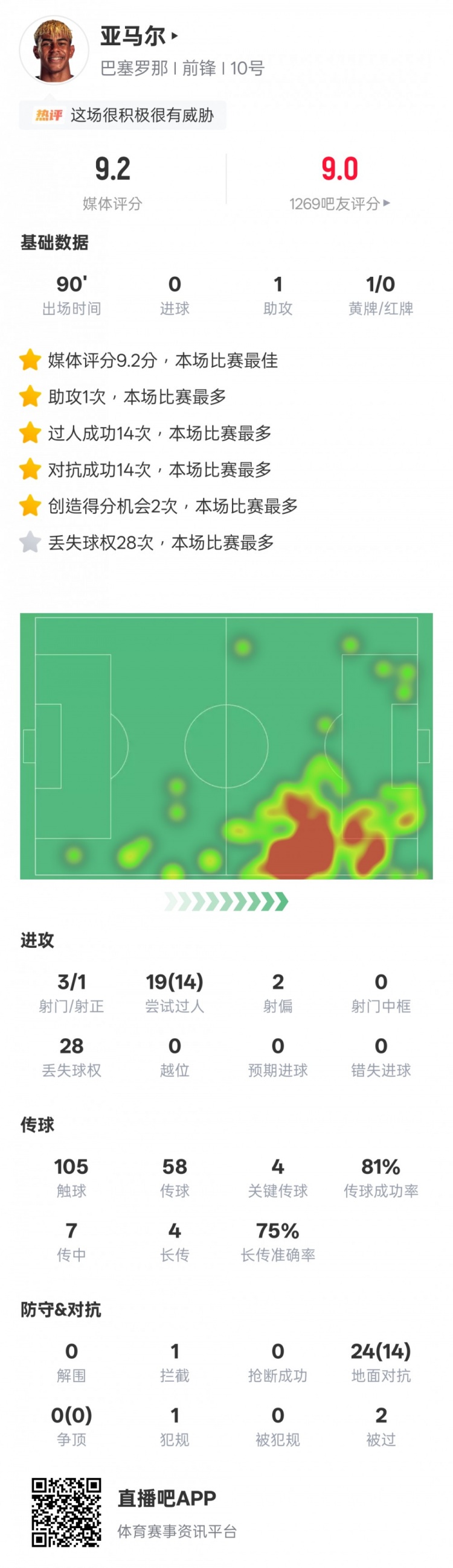 亞馬爾本場比賽數(shù)據(jù)如下: