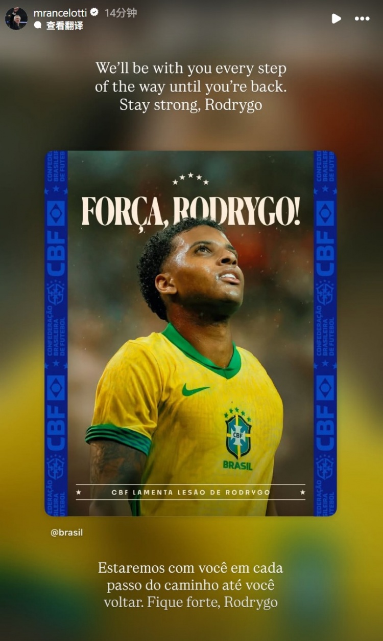 安切洛蒂寫道:“我們會一直與你在一起,直到你重回賽場。保持堅(jiān)強(qiáng),羅德里戈!”