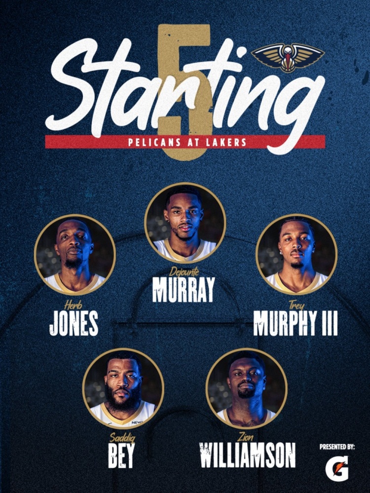 直播吧3月4日訊 鵜鶘客場(chǎng)挑戰(zhàn)湖人,首發(fā)是錫安、貝、墨菲、瓊斯、德章泰·穆雷。