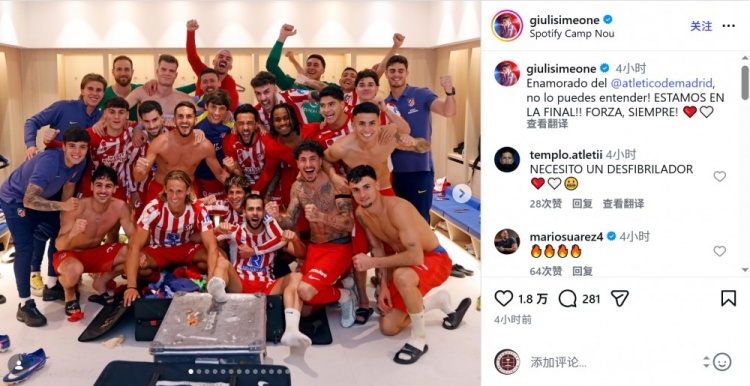 馬競前鋒朱利亞諾·西蒙尼社媒曬出與隊友們在更衣室內(nèi)的大合照,配文:“愛上馬競,這種情感你無法理解!我們晉級決賽了!加油,永遠(yuǎn)!”