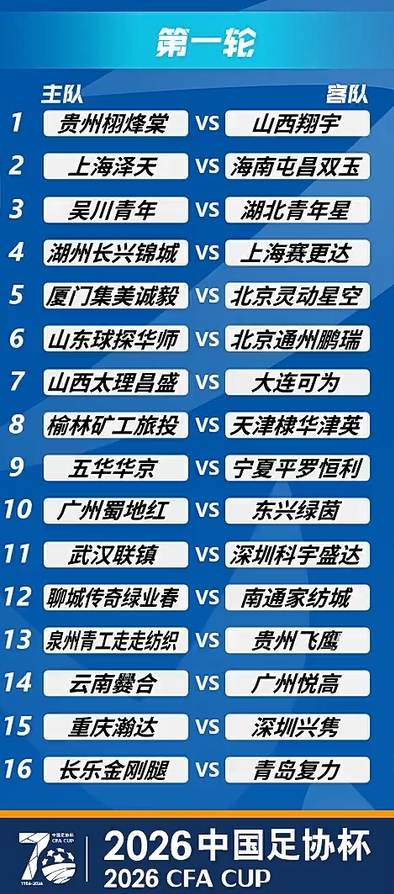 2026中國(guó)足協(xié)杯首輪比賽對(duì)陣如下:
