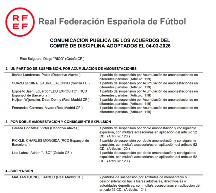 赫伊森、卡雷拉斯累計(jì)黃牌停賽,馬斯坦托諾因?qū)Σ门袉T、管理人員或體育當(dāng)局表示蔑視或不尊重,停賽兩場(chǎng),并根據(jù)紀(jì)律條例第52條處以附加罰款。